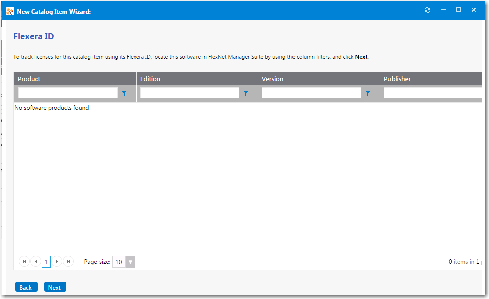 13. To track licenses for this catalog item using its Flexera ID, use the column filters to locate this catalog item in FlexNet Manager Suite, select it, and click Next. The Ready to Create panel opens.