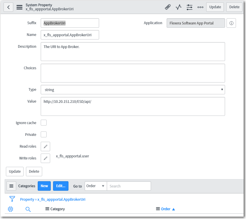 15. To connect ServiceNow to your instance of App Portal, click on x_fls_appportal.AppBrokerUrl. The System Property view for that property opens.