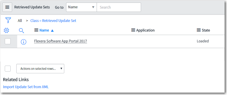 6. Click Choose File, select the Flexera Software App Portal update set .xml file and click Upload. When the upload is complete, the file will be listed on the Retrieved Update Sets page.