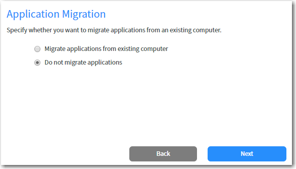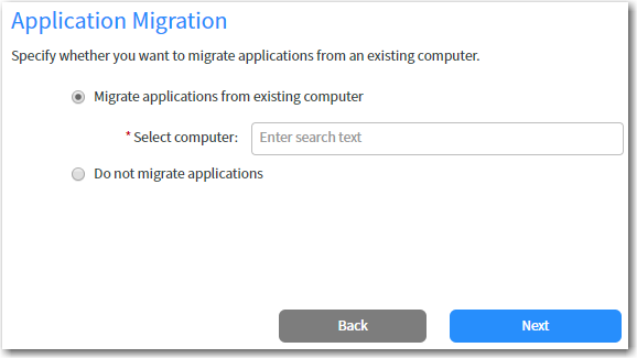 11. If you want to migrate applications from an existing computer to the target computer, select the Migrate applications from existing computer option. If you select this option, the Select computer field is displayed, where you are prompted to search for the existing computer.