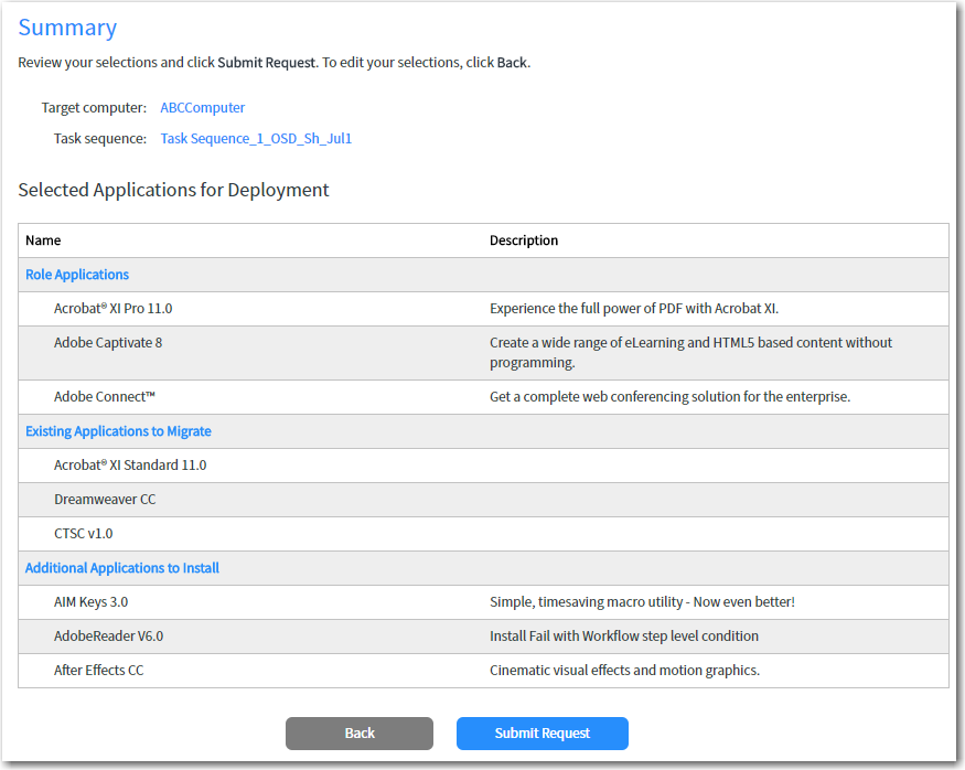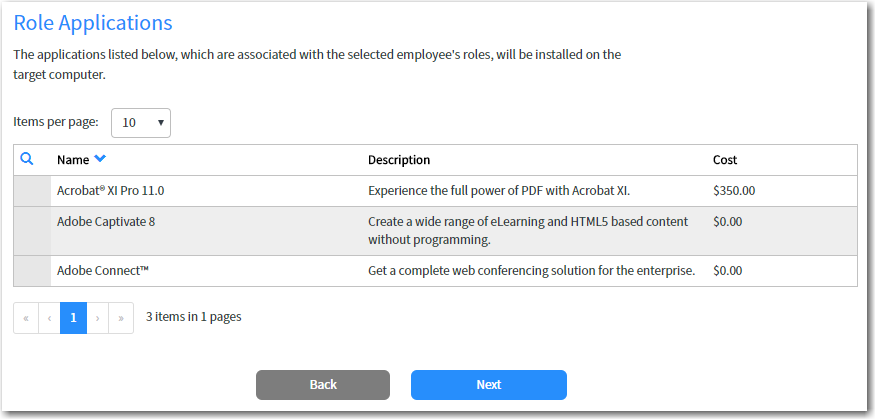 9. From the Task sequence list, select the task sequence corresponding to the action you want to take, and then click Next. The Role Applications panel opens, listing the applications that are associated with the selected employee’s roles, which will be installed on the target computer.