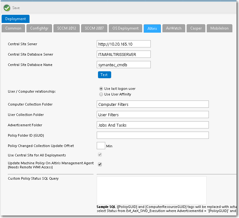 2. In the Central Site Database Name, enter the database name of the Altiris Notification Server database.
