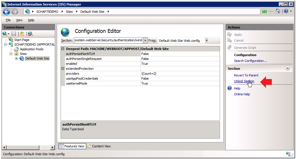 In the Actions panel on the right, click Unlock Section.